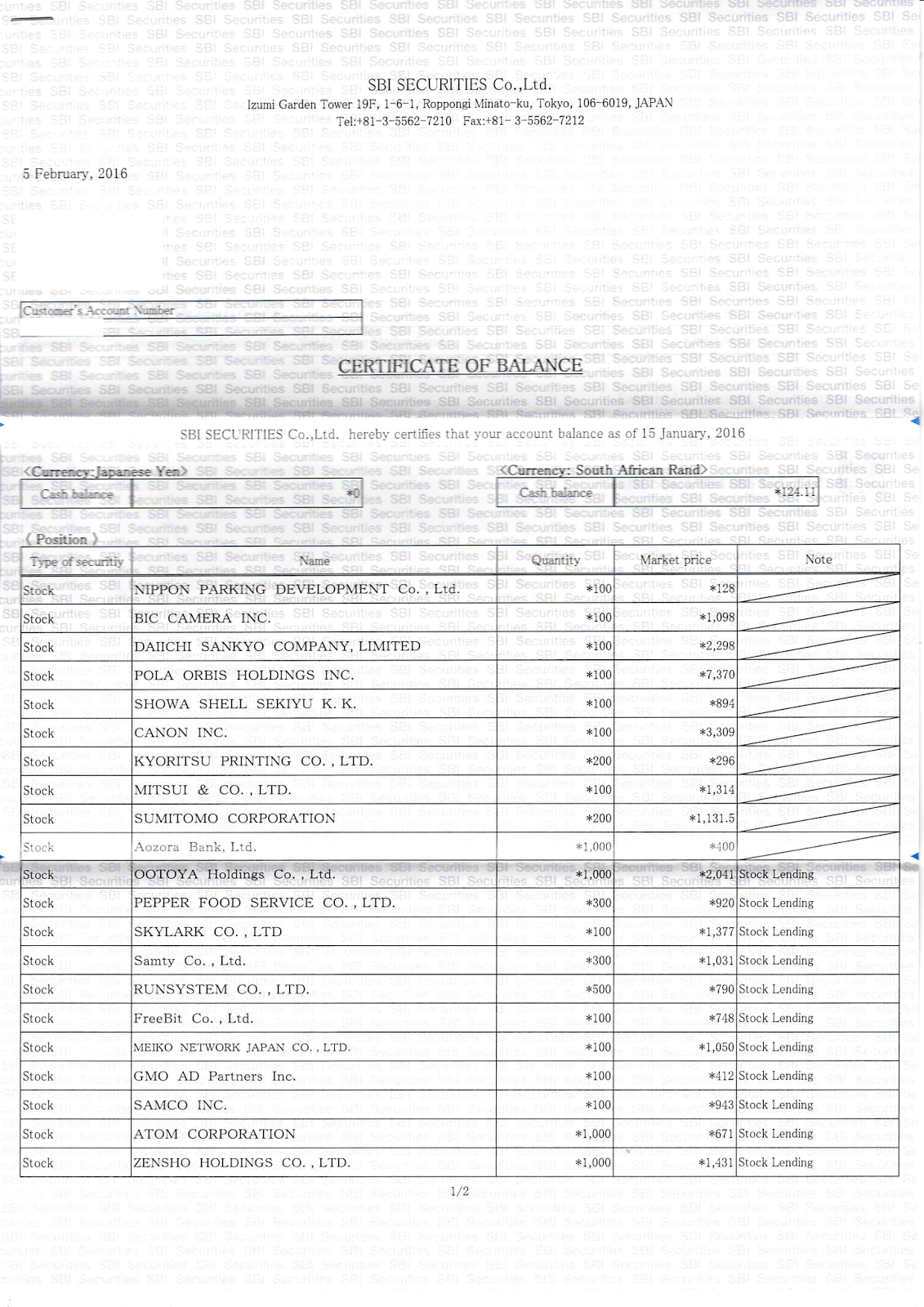 英文残高証明書の実物はこんな感じ。何だかんだで英文対応できる証券会社は少ないので、そのような中でSBIはいろいろと準備してくれるのでありがたい。