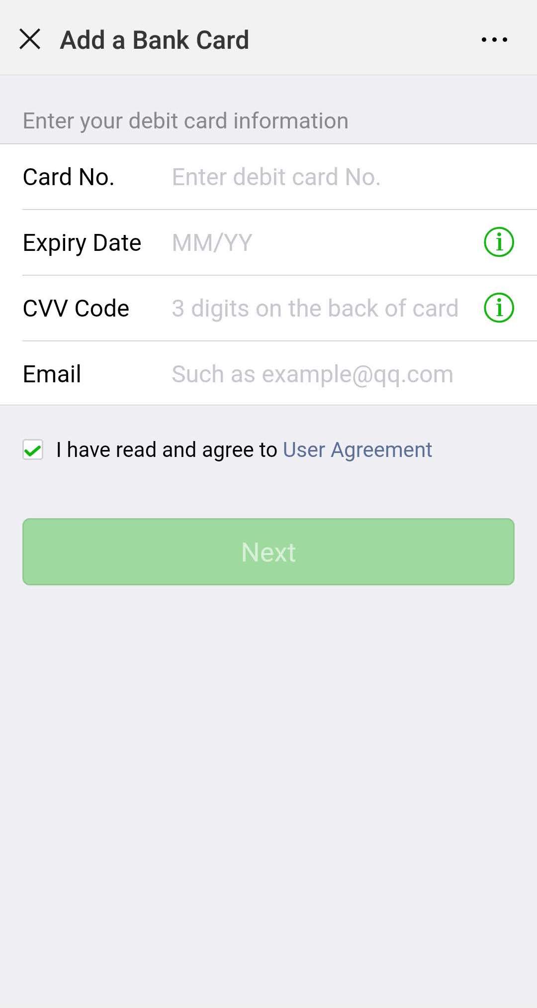 WeChat Payでチャージ残高の授受を行うには本人確認が必要となるので、ここでクレジットカードの登録を進める。