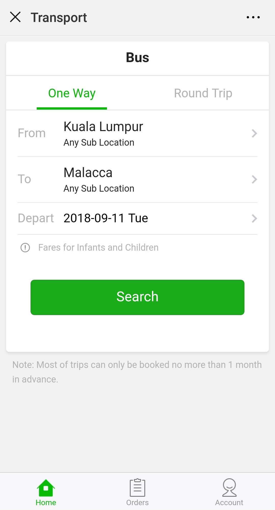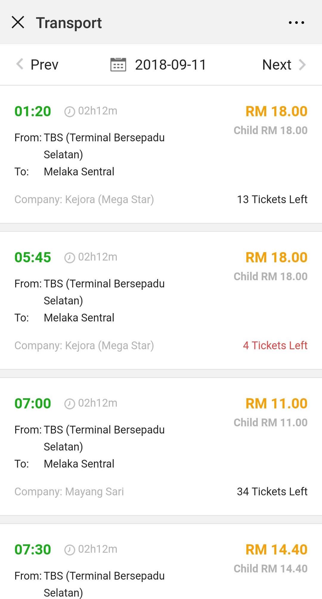今回クアラルンプール発/マラッカ着の路線予約を試しに途中まで進めてみた。