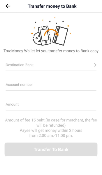 銀行口座へ出金する場合はアプリ内で口座情報を入力して送金する。こちらは15バーツの手数料がかかる。