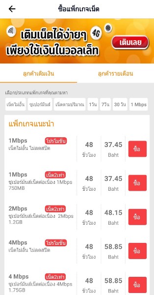 TrueMoney Walletの場合は系列の通信会社TrueMoveのトップアップとパッケージ購入に対応しており、アプリ内で手続きを行うことが出来る。