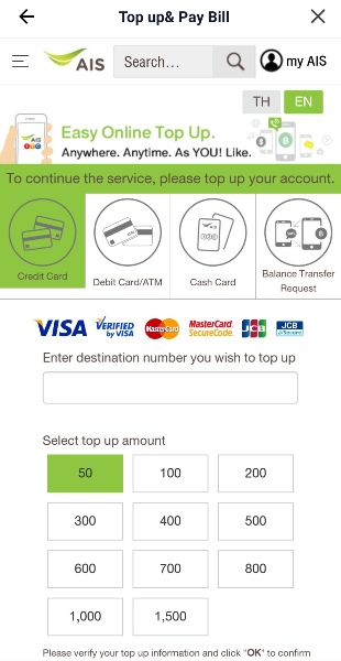 TrueMove以外の大手通信会社AISとDTACの場合はトップアップのみに対応しているが、手続きは先程のバーチャルプリカを使ってカード決済を行う流れになる。