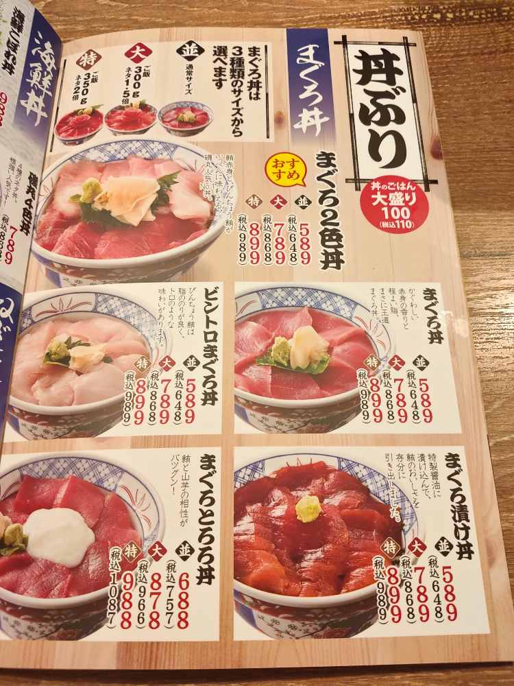 メニューは海鮮丼を中心とした内容となっておりマグロ丼の並盛は税込みで648円。海鮮丼以外には焼き魚定食やフライ定食も用意されているので生ものが苦手の人も問題はない。